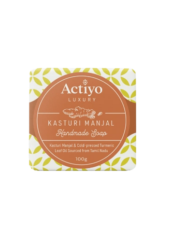 Experience the ultimate skin detox with Actiyo Luxury's Kasturimanjal Handmade Soap. Enriched with purifying Kasturi Manjal paste and cold-pressed Turmeric leaf oil from Tamil Nadu, this soap helps to de-tox, de-tan, and brighten your skin.